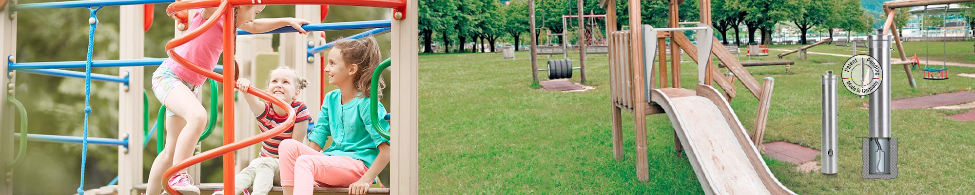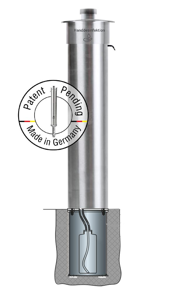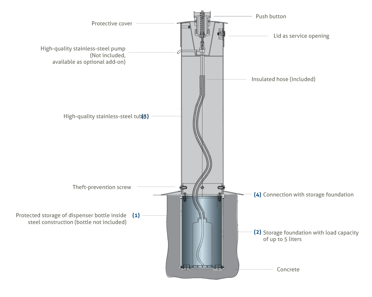 The sanitizer is stored safely underground in a sturdy steel foundation set in concrete. This underground storage provides natural insulation and protection. It also reduces the influence of temperature fluctuations on the sensitive liquid – and all without the need for electricity!