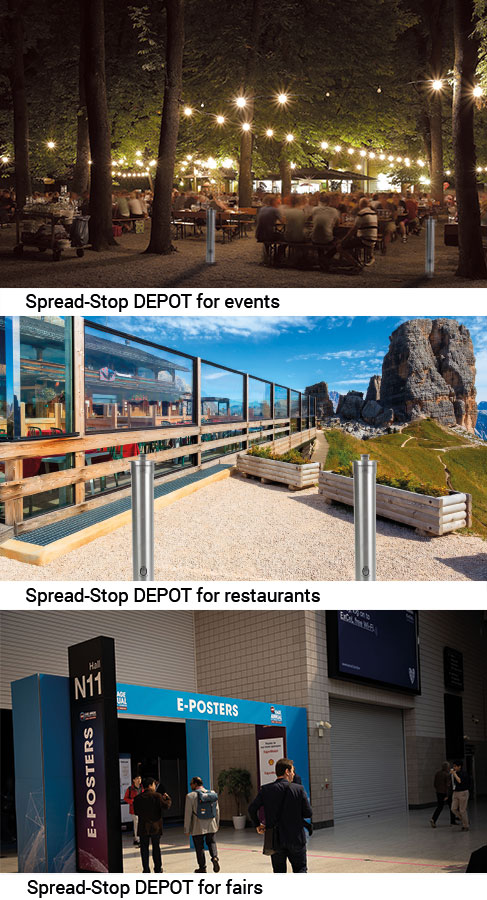 Thanks to its sturdy design, the Spread-Stop dispenser can also serve as a bollard. This is important wherever the flow of people must be guided or where a bumper buffer is needed.